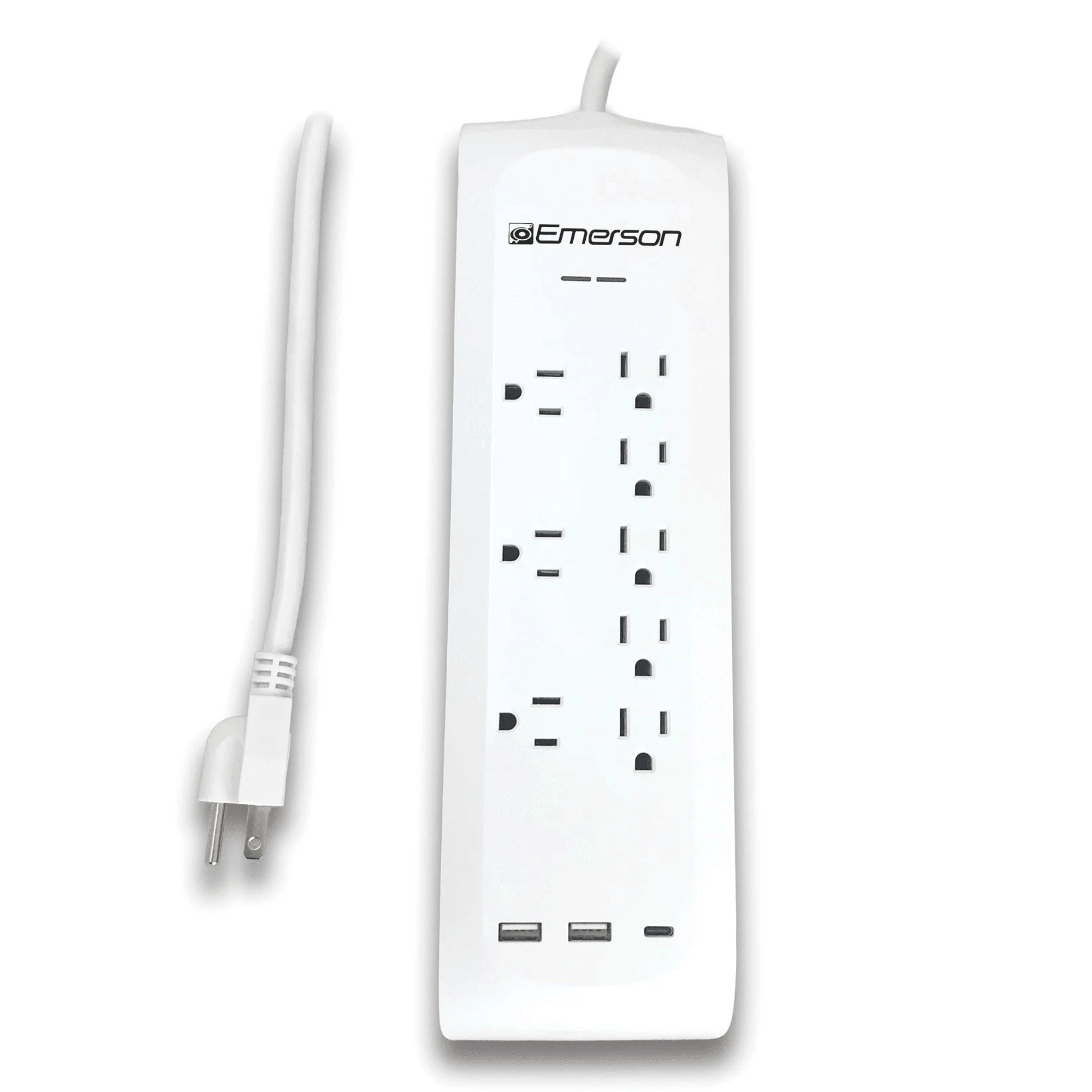 Introducing the Emerson 11-in-1 Multi-Outlet Surge Protector Charging System. Enjoy the convenience of charging multiple devices simultaneously with its 8 built-in AC outlets and 3 USB ports. Keep your devices safe with built-in surge protection and control power with the dedicated on/off switch. Upgrade to a sophisticated charging experience.